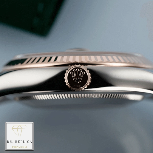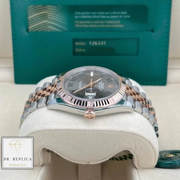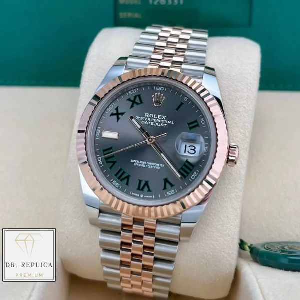 Experience the Rolex Datejust Grey and Wimbledon Dial – a sophisticated timepiece crafted from premium 904L Stainless Steel and Gold Plated steel with a Fluted Steel and Rose gold bezel. Available in both 36MM or 41MM case sizes, it features a sapphire crystal and a Grey and Wimbledon dial with Roman Numerals and sharp steel hands.