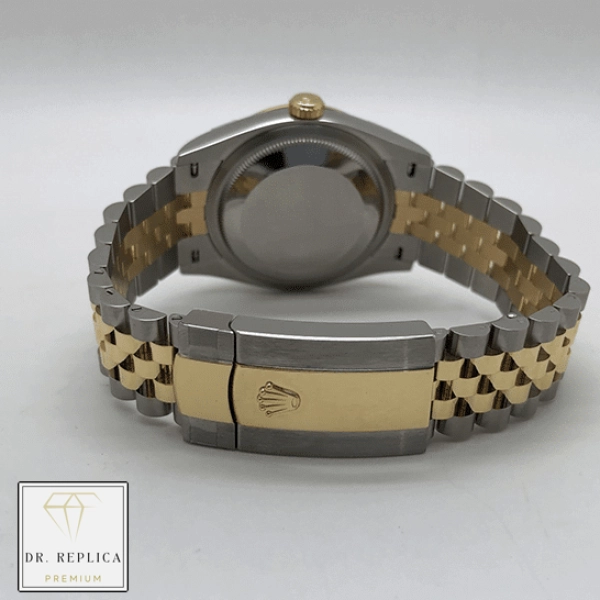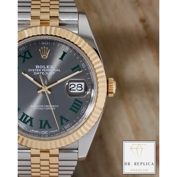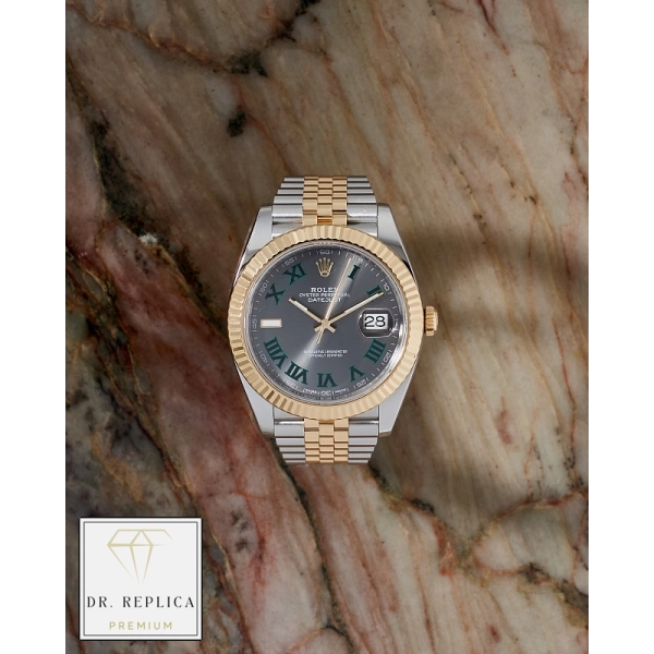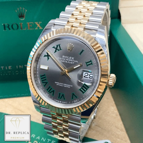 Experience the Rolex Datejust Grey and Wimbledon Dial – a sophisticated timepiece crafted from premium 904L Stainless Steel and Gold Plated steel with a Fluted Steel and Yellow gold bezel. Available in both 36MM or 41MM case sizes, it features a sapphire crystal and a Grey and Wimbledon dial with Roman Numerals and sharp steel hands.