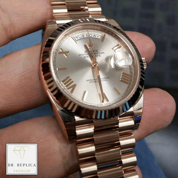 Experience the Rolex Day Date Silver Dial – a sophisticated timepiece crafted from premium 904L Stainless Steel and Gold Plated steel with a Fluted Rose Gold bezel. Available in both 36MM or 40MM case sizes, it features a sapphire crystal and a Silver dial with Roman Numerals and sharp steel hands.