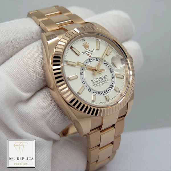 Experience the Rolex Sky Dweller White Dial – a sophisticated timepiece crafted from premium 904L Stainless Steel and Gold Plated steel with a Fluted Everose Gold bezel. Available in both 42MM case sizes, it features a sapphire crystal and a White dial with Index Markers (Luminous) and sharp steel hands.